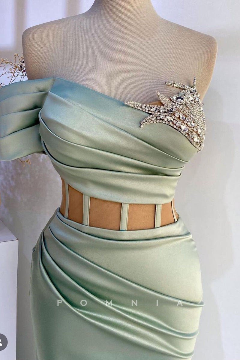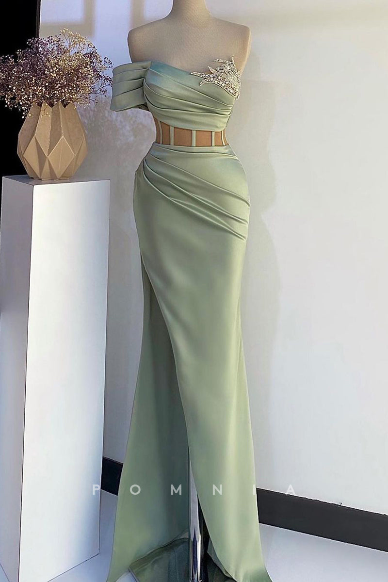 P1390 - Off-Shoulder Beads Pleats Side Slit Long Satin Prom Evening Formal Dress