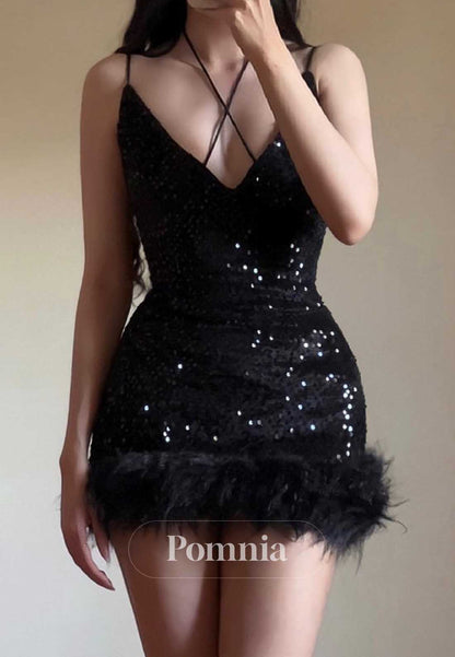 Spaghetti Straps V-Neck Sequins Feathers Homecoming Dress