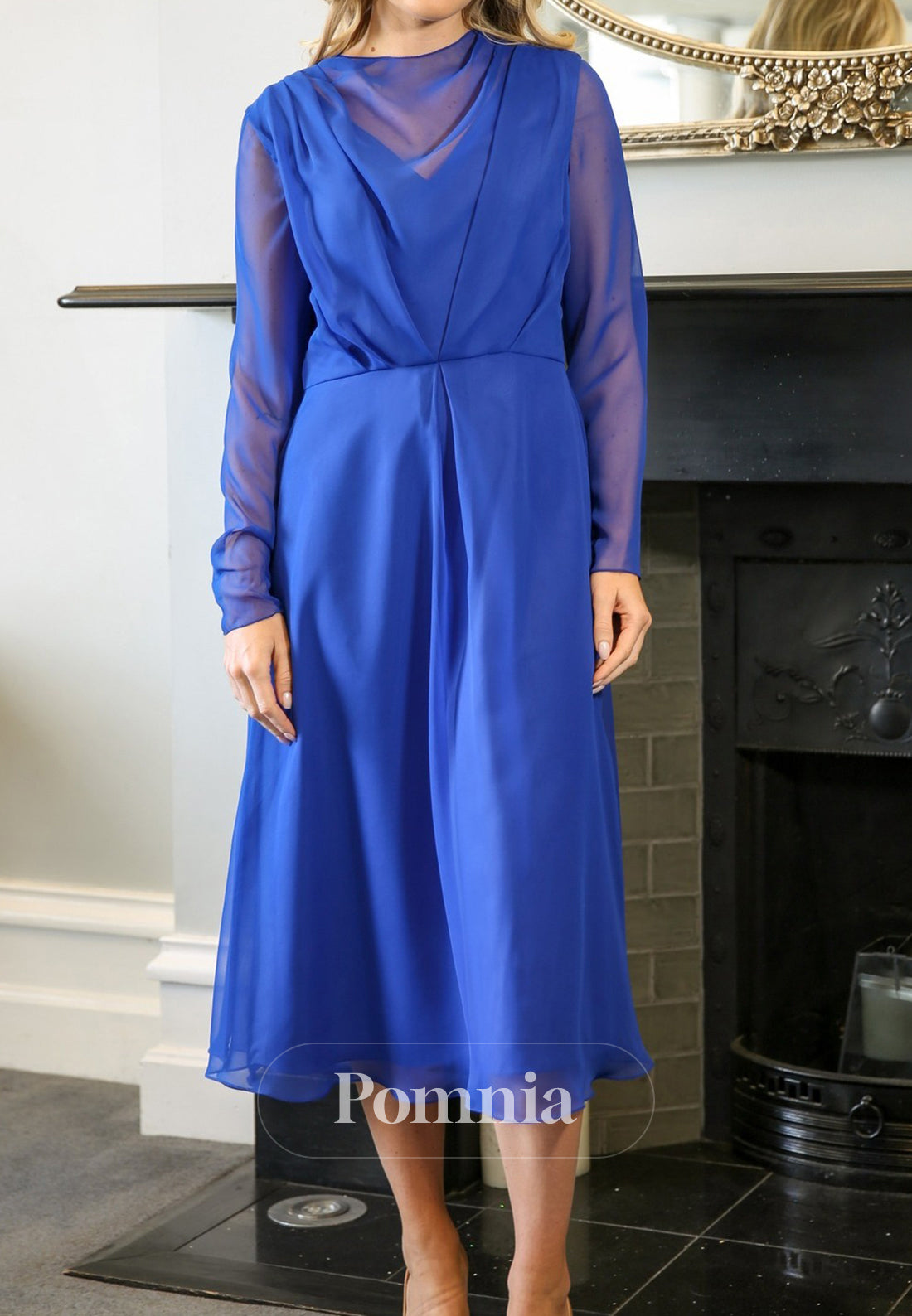 Royal Blue Long Sleeves Scoop A-Line Chiffon Mother of the Bride Dress