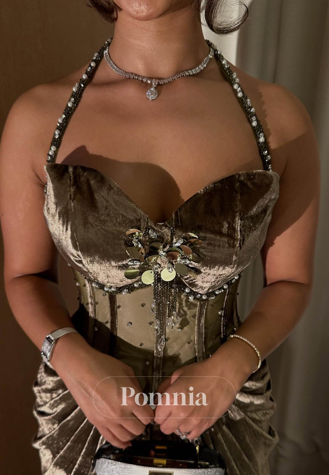 Elevate your evening wardrobe with this sophisticated A-line halter dress, crafted from luxurious velvet that drapes beautifully. The sleeveless halter neckline creates a striking silhouette while strategic ruching adds dimension and flatters the figure. The flowing A-line skirt provides graceful movement and timeless elegance, making this piece ideal for formal events, galas, and special occasions. Versatile enough to pair with statement jewelry or keep understated, this dress delivers refined glamour with effortless poise.