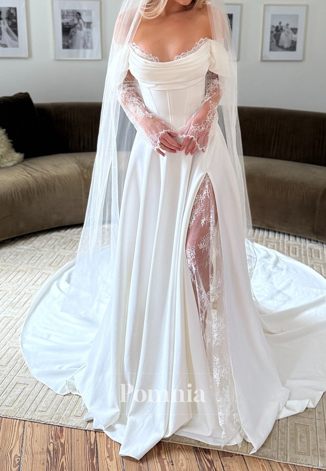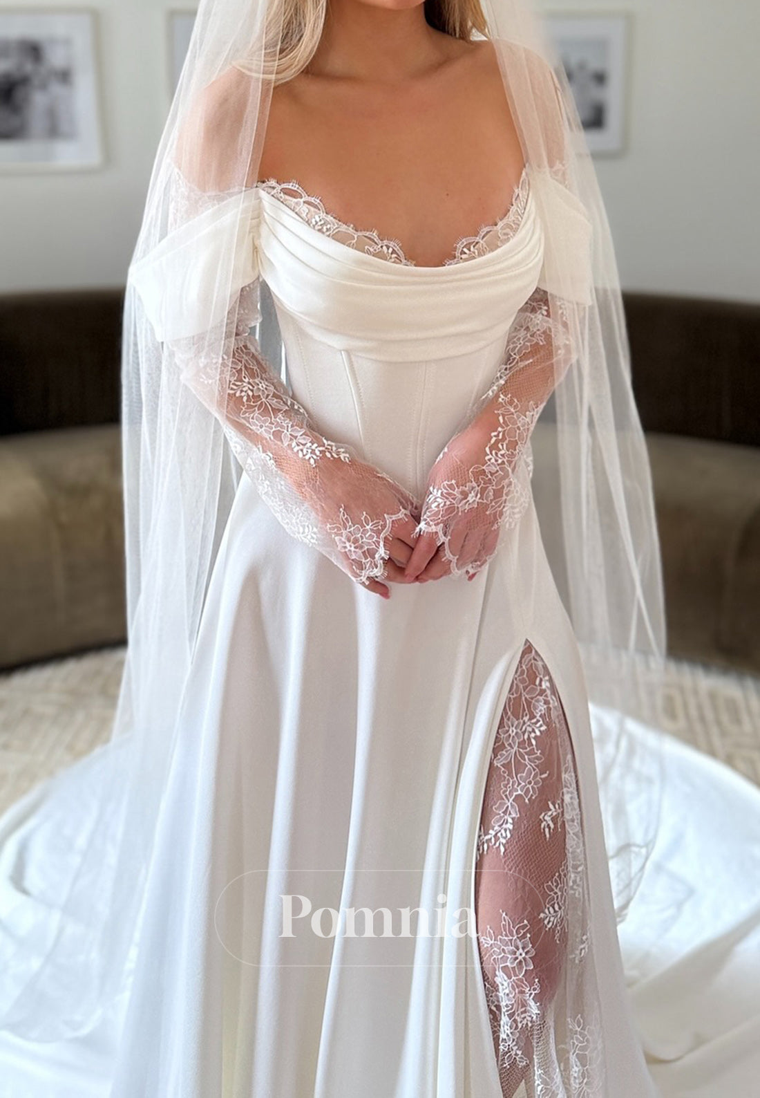 Long Sleeves Scoop Slit Ruched Satin Wedding Dress