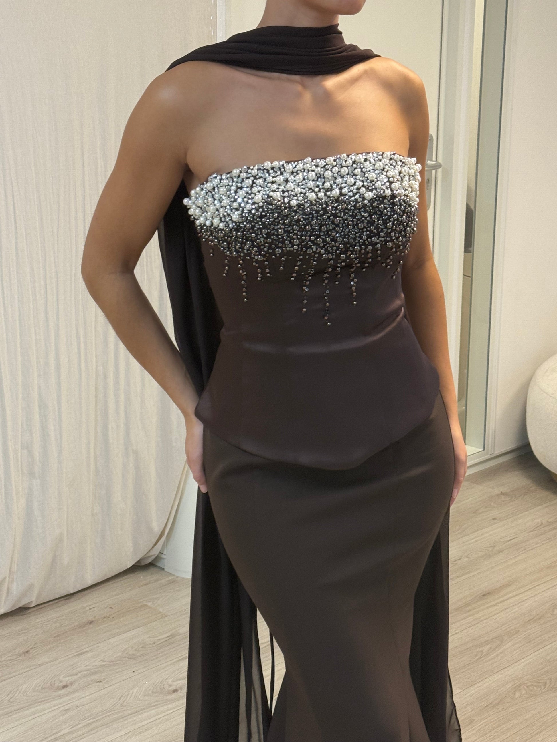 The Areya dress exemplifies refined evening elegance with its sophisticated brown palette and lustrous pearl embellishments. This statement piece features carefully placed pearls that catch light beautifully, creating dimension and visual interest throughout the silhouette. Crafted for those who appreciate timeless glamour, the dress delivers a polished aesthetic suitable for formal occasions, galas, and upscale events. The combination of rich brown tones with pearl detailing offers versatility in styling while maintaining an undeniably luxurious appearance. Perfect for making a memorable impression at any evening affair.