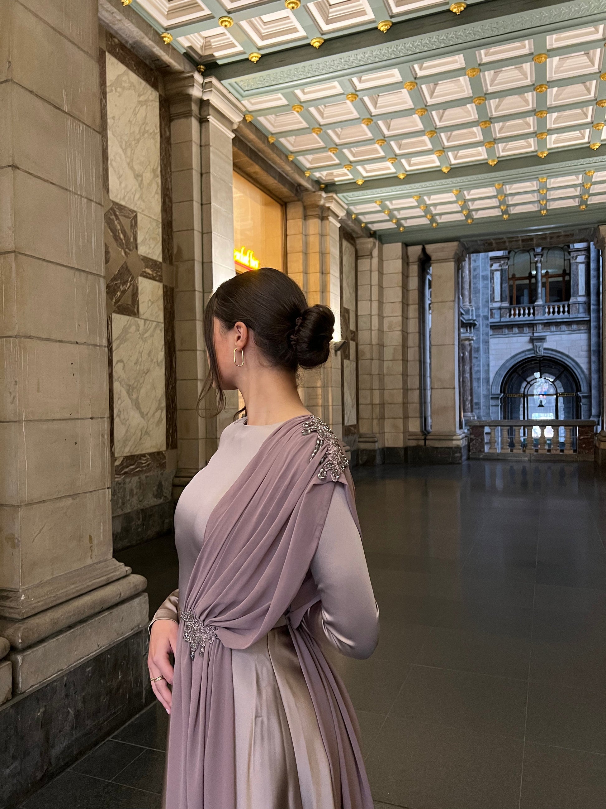 Elevate your formal wardrobe with this sophisticated purple evening gown, designed for those who appreciate refined elegance. The classic bateau neckline frames the shoulders beautifully, while long sleeves provide graceful coverage and timeless appeal. A functional back zipper ensures a seamless fit and easy wear. Crafted with attention to detail, this gown delivers the polished, upscale look essential for galas, black-tie events, and formal occasions where understated luxury matters.