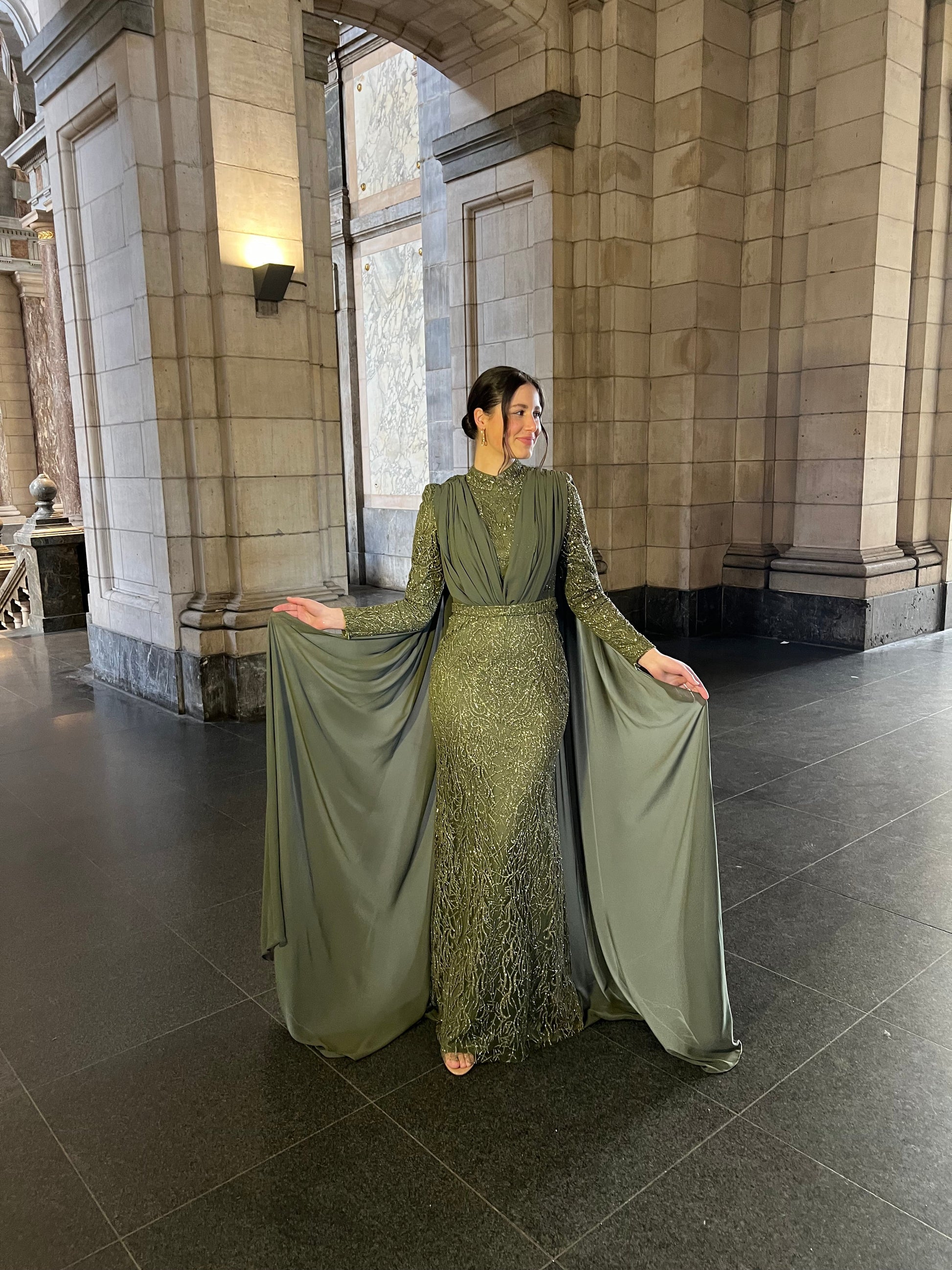Elevate your evening wardrobe with this sophisticated celadon column dress, designed for those who appreciate refined elegance. The high neckline and long sleeves provide graceful coverage, while intricate beading details add a touch of glamour and dimension. The streamlined column silhouette flatters the figure with its clean, modern lines, making it an ideal choice for formal events, galas, or upscale celebrations. Crafted with attention to detail, this piece combines timeless style with contemporary sophistication for a memorable appearance.