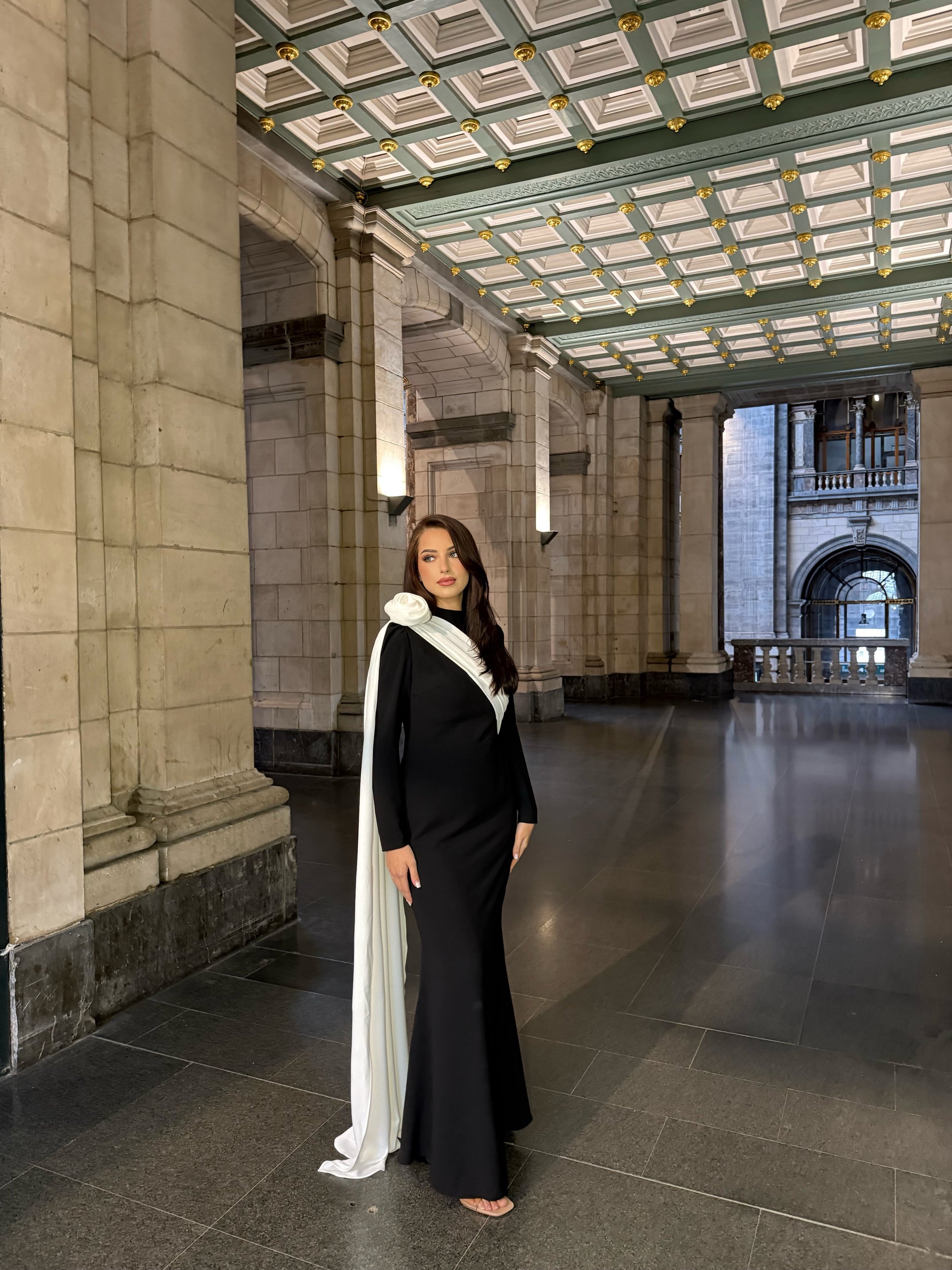 Elevate your evening elegance with this striking mermaid gown, where sophisticated black-and-white contrast meets dimensional floral artistry. The long sleeves provide refined coverage while the meticulously crafted 3D flowers create dramatic visual interest across the silhouette. The classic mermaid cut hugs your curves gracefully before flowing into an impressive train, making this piece ideal for formal galas, black-tie events, and unforgettable celebrations. Premium construction ensures both comfort and confidence as you command attention throughout the night.