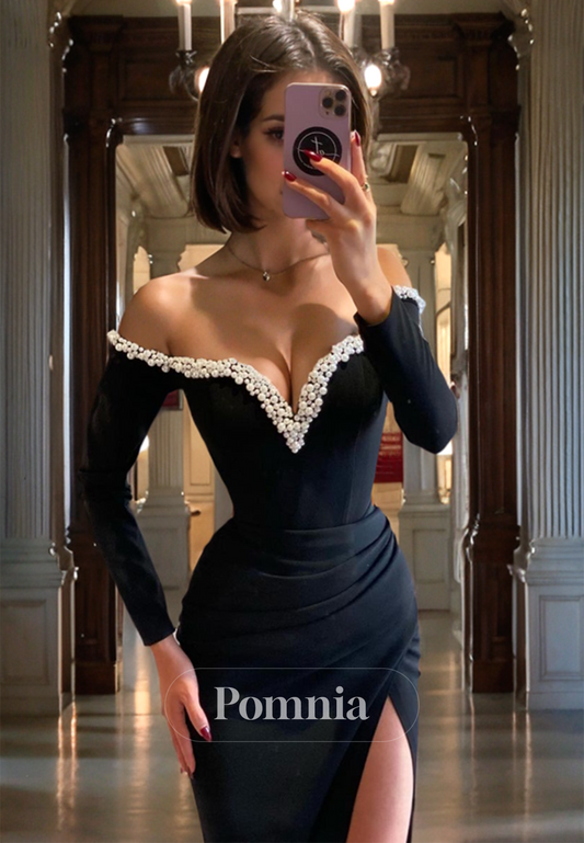 Off-Shoulder Deep V-Neck Pearls Long Sleeves Side Slit Long Prom Party Dress