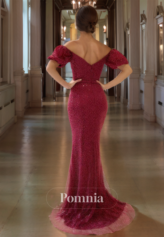 Off-Shoulder Scoop Pleated Side Slit Sequined Mermaid Long Prom Dress