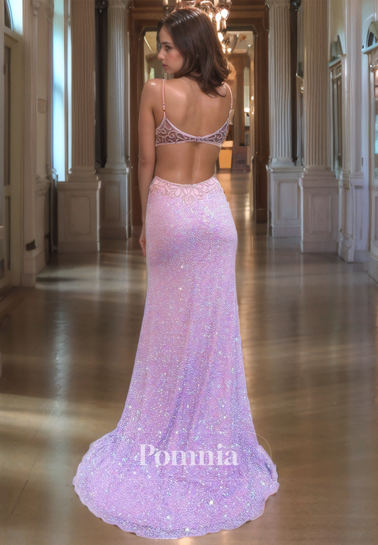 Spaghetti Straps V-Neck Sequined Sleeveless Side Slit Long Prom Dress