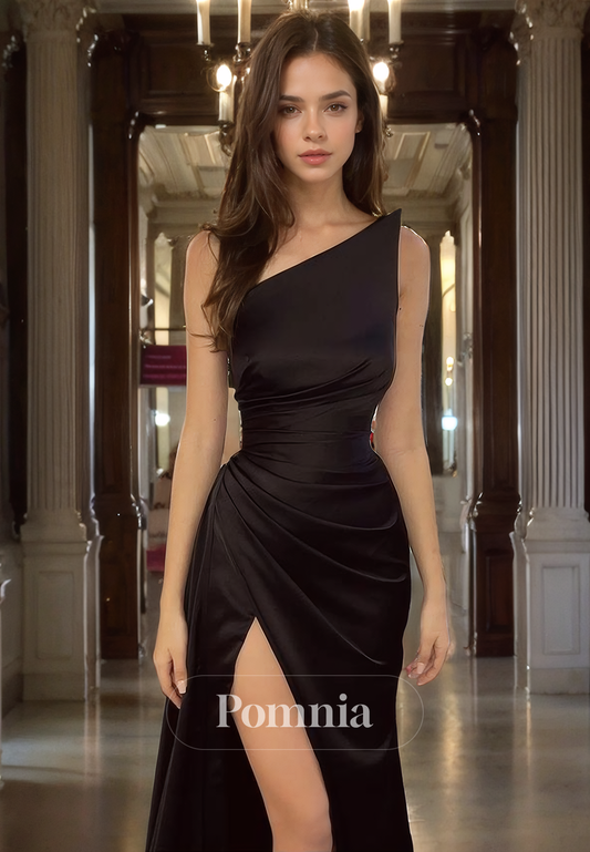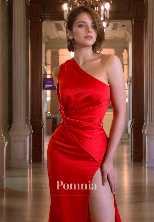 A-Line Empire-Waist One Shoulder Pleated High Slit Satin Long Prom Dress