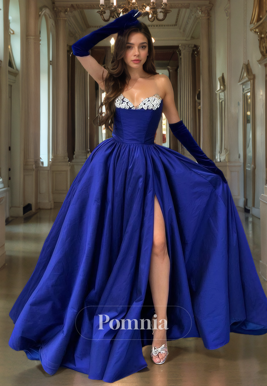 P2089 - A-Line Strapless Sweetheart Appliques High Slit Long Prom Formal Dress