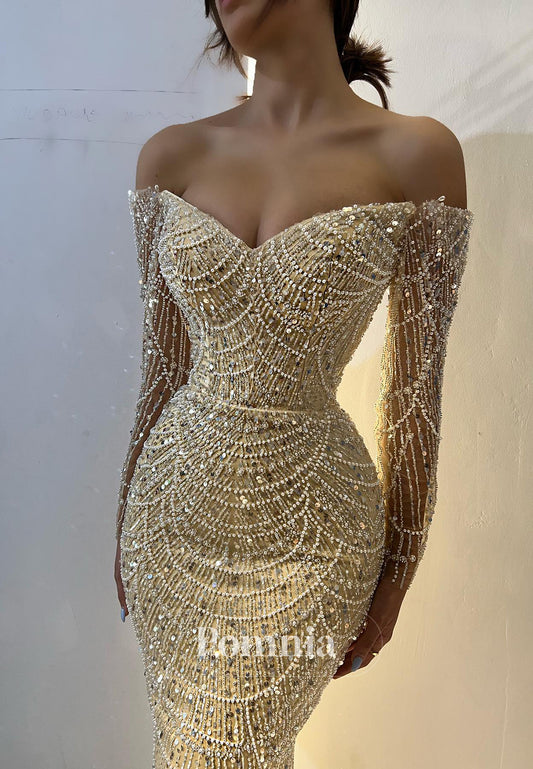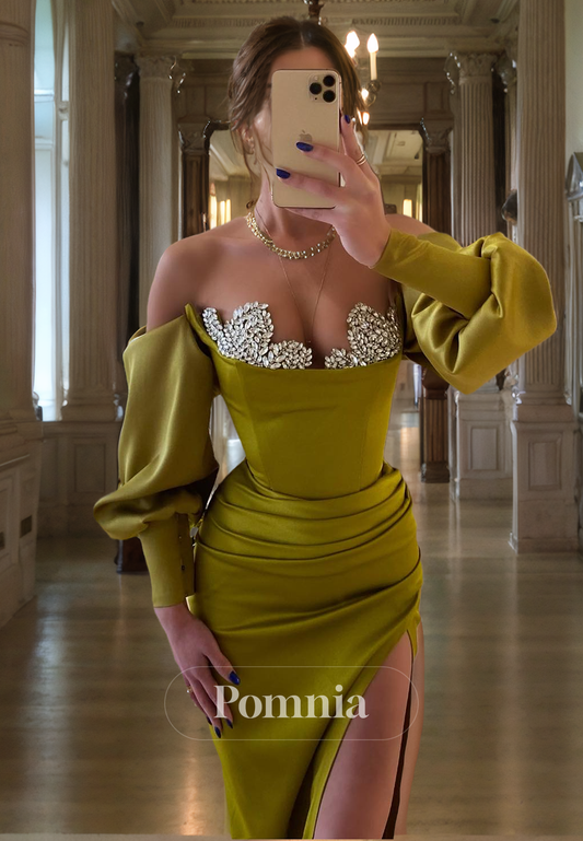 Off-Shoulder Sheath/Column Sweetheart Beaded Pleated Long Sleeves Prom Dress