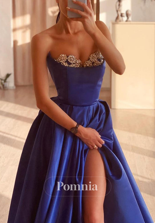 P1997 - A-Line Strapless Empire-Waist Beaded High Split Sleeveless Prom Evening Dress