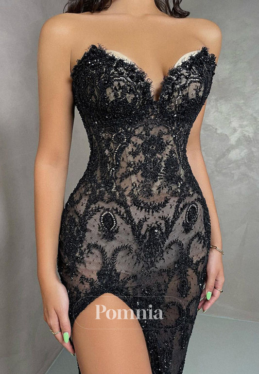 P2056 - Stunning Strapless Lace High Slit Rhinestone Long Prom Evening Formal Dress