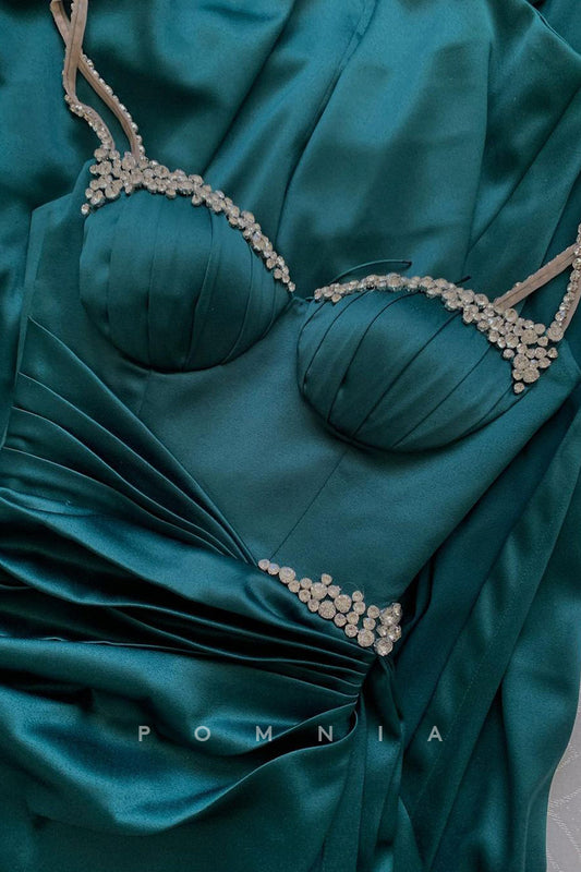 P1995 - A-Line Empire-Waist Straps Sweetheart Pleated Side Slit Satin Long Prom Formal Dress
