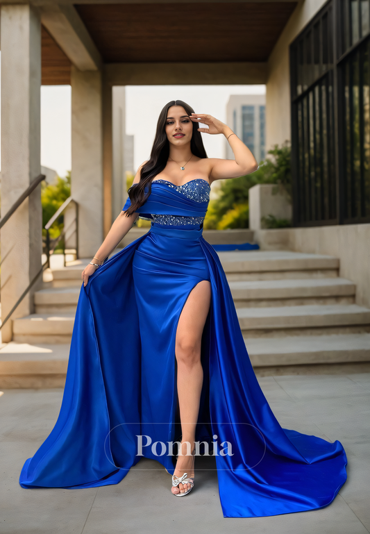 P2084 - Off-Shoulder Sweetheart Pleated High Slit Empire-Waist Long Prom Evening Dress