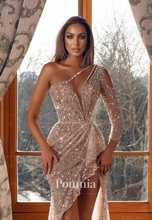 P2096 - Sheath/Column Slopping Shoulder Sequins High Slit Prom Evening Formal Dress