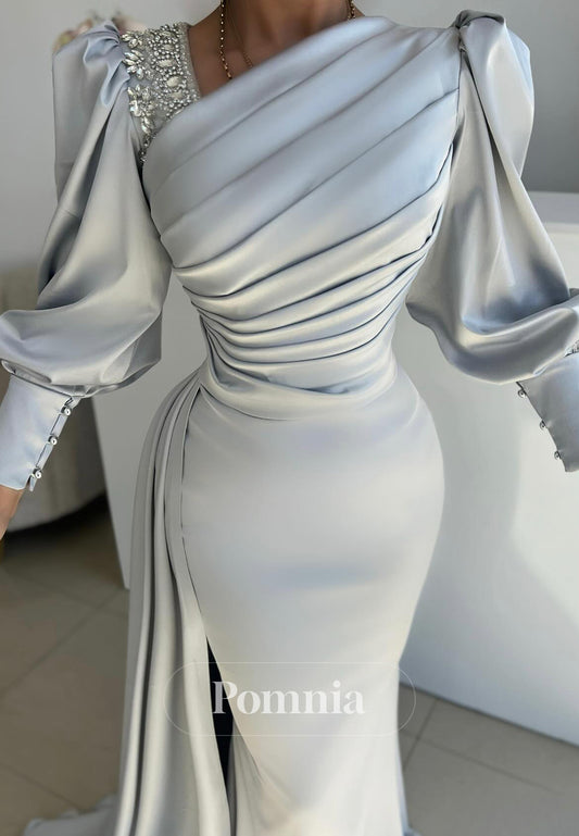 Sheath/Column Long Sleeves Pleated Empire-Waist Long Prom Evening Dress with Slit