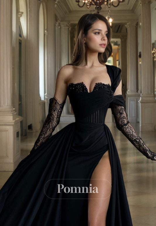 Sheath/Column Sweetheart Beaded Long Sleeves Side Slit Long Prom Dress