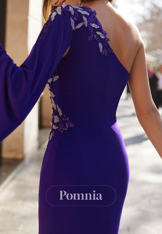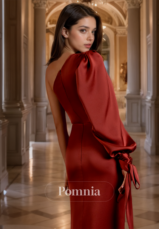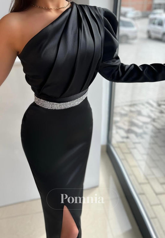 P1205 - One Shoulder Long Sleeves High Slit Pleats Long Prom Evening Dress