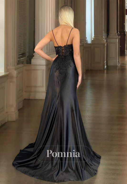 P1314 - Spaghetti Straps V-Neck Lace Appliques Side Slit Evening Prom Formal Dress
