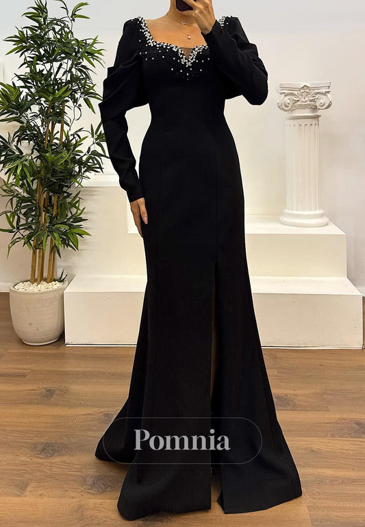 Long Sleeves Square Beads Slit Ruched Evening Dress