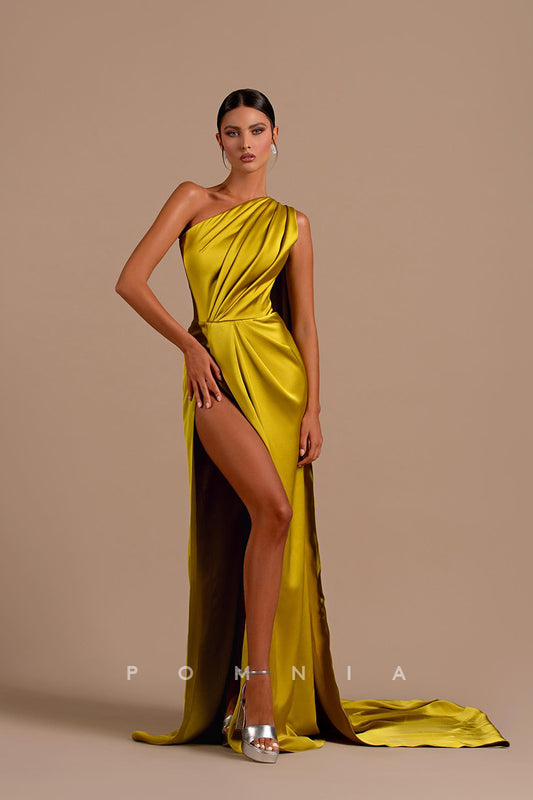 P1200 - Classy One Shoulder High Slit Pleats Sleeveless Long Prom Evening Dress