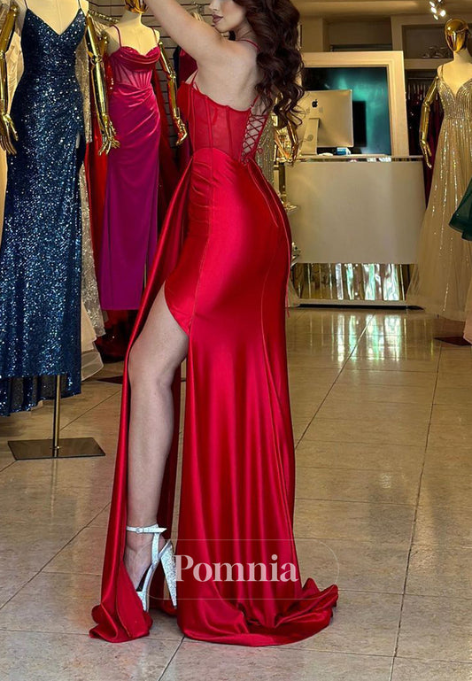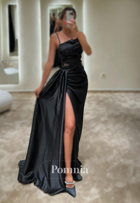 P1563 - Spaghetti Straps V-Neck High Split Pleats Sleeveless Satin Prom Evening Formal Dress