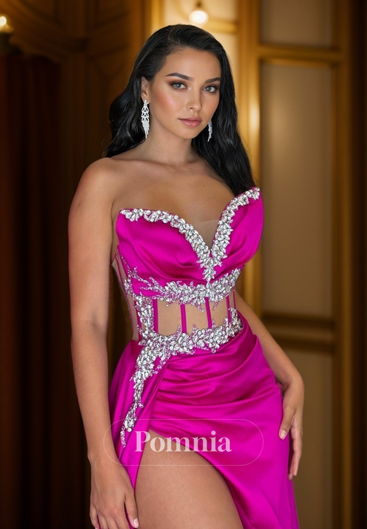 P1624 - Strapless Sweetheart Pleats High Split Sleeveless Satin Prom Evening Dress