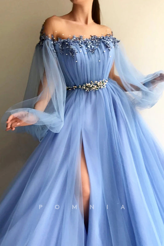 P1927 - A-Line Strapless Beaded Empire-Waist High Slit Tulle Long Sleeves Formal Evening Prom Dress