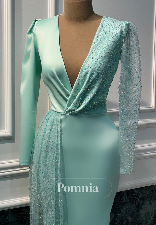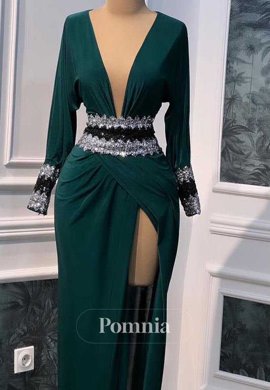 Deep V-Neck Long Sleeves Sequins Slit Evening Dress