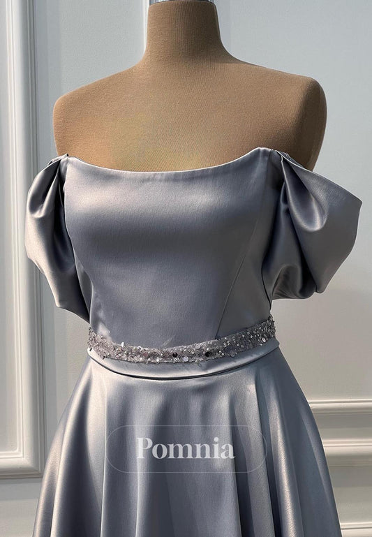 P1623 - Off Shoulder Round Sleeveless High Split Satin Long Prom Party Evening Dress