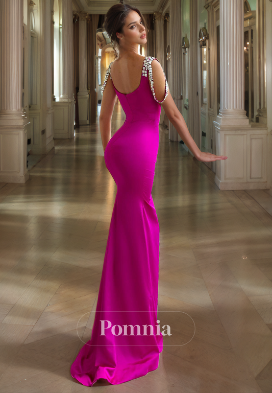 P1807 - Mermaid Scoop Beads Straps Pleats Sleeveless Straight Prom Evening Party Dress