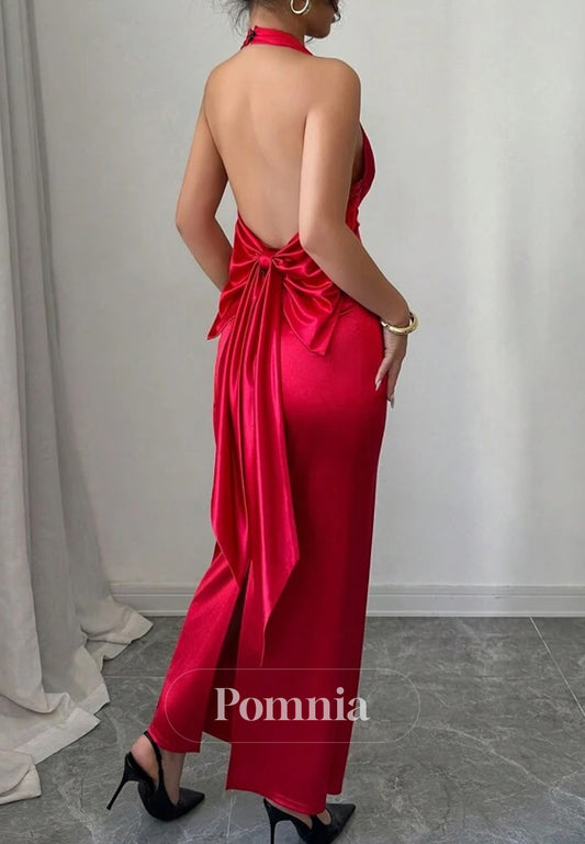Red Halter Sleeveless Bowknot Backless Evening Dress