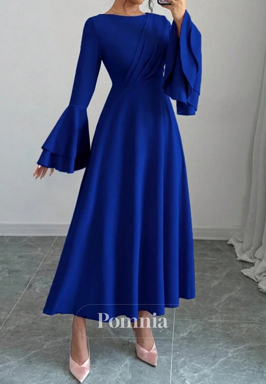 Royal Blue A-Line Scoop Long Sleeves Empire-Waist Evening Dress