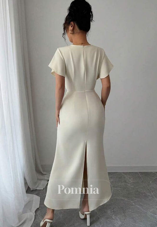 White Short Sleeves V-Neck Empire-Waist Chiffon Evening Dress