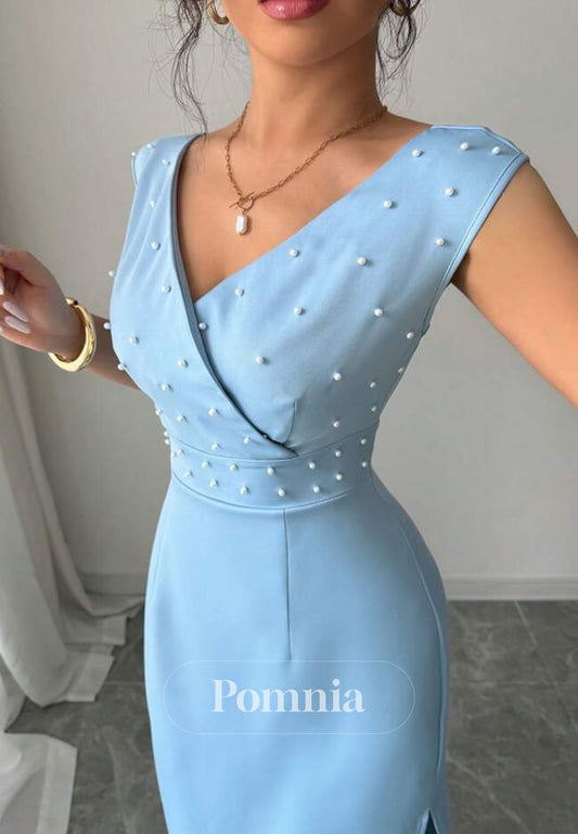 Sky Blue Sheath Sleeveless V-Neck Slit Pearls Evening Dress