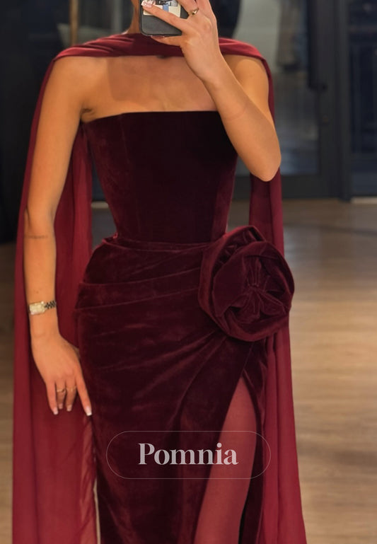 Burgundy Strapless Sleeveless Floral Appliques Evening Dress