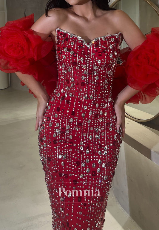Red Strapless Sleeveless Floral Appliques Ruched Evening Dress
