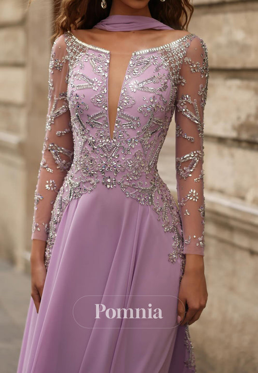 Lilac Long Sleeves V-Neck Appliques Backless Evening Dress