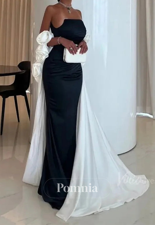 Black and Pink Satin Strapless Sheath Long Formal Dress