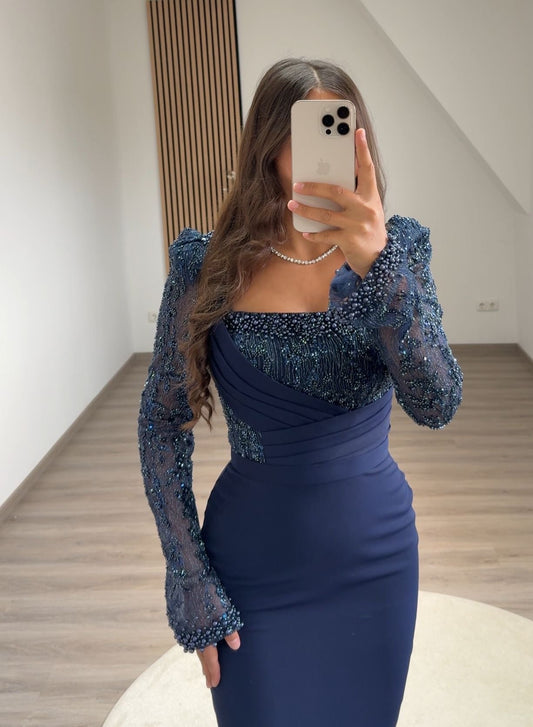 Dark Navy Long Sleeves Scoop Appliques Evening Dress