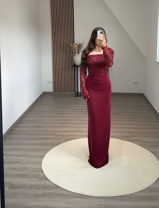 Long Sleeves Scoop Prom Dress with Pearls Corset Evening Party Dress