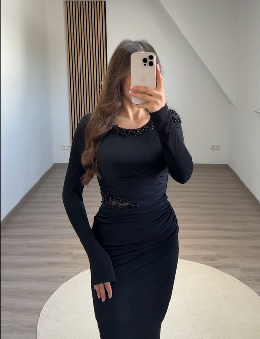 Black Long Sleeves Square A-Line Appliques Prom Dress