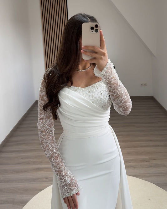 Long Sleeves Sweetheart Long A Line Prom Dress With Pleated Beading