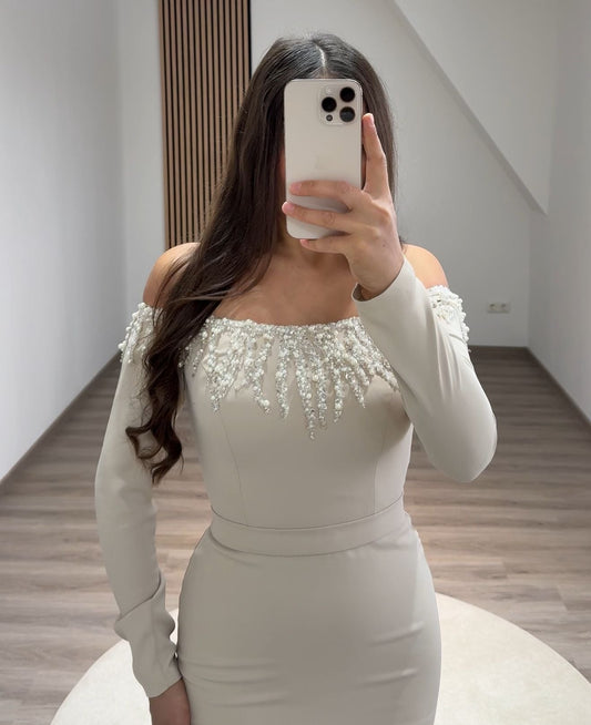 Elegant Long Sleeves Scoop Empire-Waist Pearls Satin Formal Dress