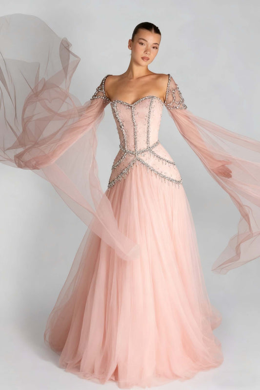 Long Sleeves Off-Shoulder Corset Tulle Evening Dress