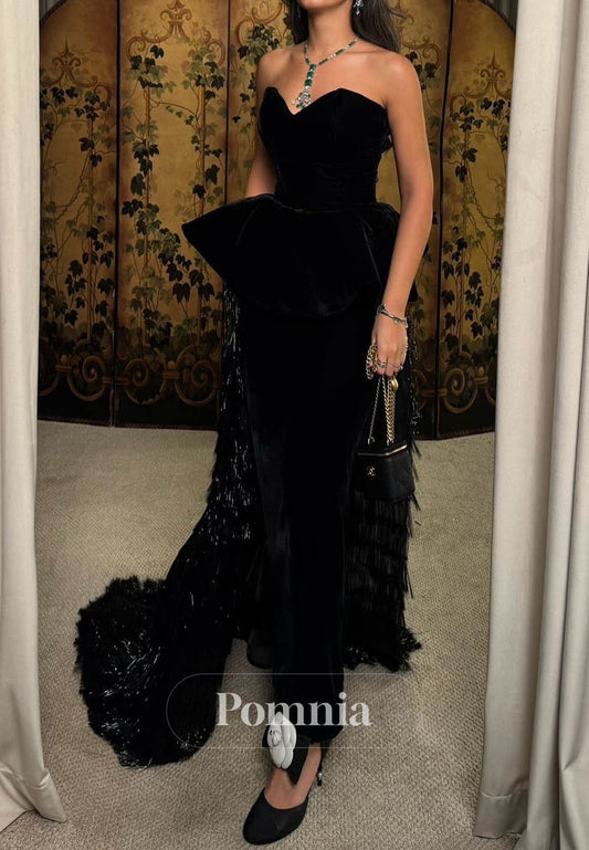 Black Velvet Strapless Long Holiday Party Dress with Feather