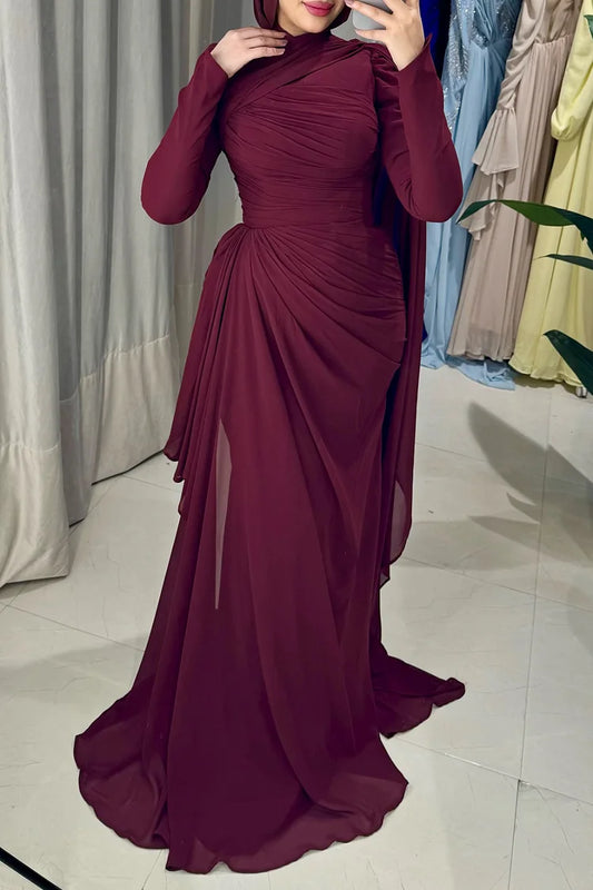 Draped Ruched Train Mock Neck Cinch Waist Party Maxi Dress