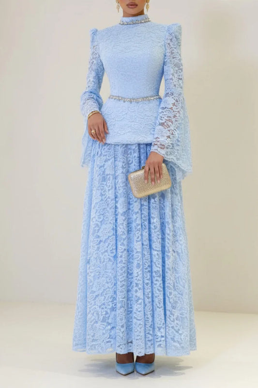 Beady Decor Lace Round Neck Long Sleeve Party Maxi Dress