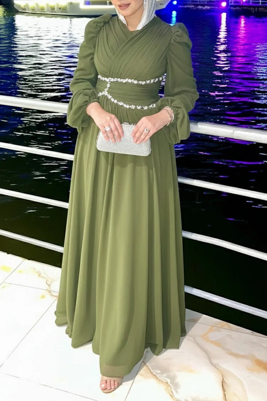 Pearl Beads Embroidery Square Neck Pleated Long Sleeve Maxi Dress